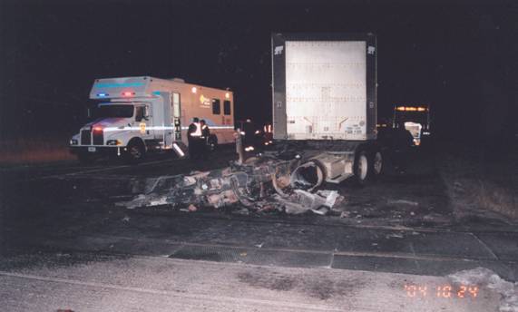 As the third truck neared the crossing, the third driver and his helper, his wife, saw flashing signal lights through the fog and saw the second truck's brake lights come on as it veered sharply to the left. They saw a fire followed by an explosion. They came to a stop near the fire. The third driver then backed his truck clear to avoid the fire and to avoid being struck by any approaching vehicle. Using a cell phone, he called the lead driver to advise him of the accident, then asked his wife to call 911. He then located the seriously injured helper on the ground about 10 feet (3 m) south of the crossing and the second driver in the tractor cab, which was sitting upright between the rails about 100 feet (30 m) south of the crossing. The second driver, who was seriously injured but not in danger, was left in the cab. The third driver and his wife made the seriously injured helper as comfortable as possible until help arrived.