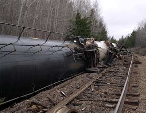 - The train derailed as a result of a combination of track conditions (excessive superelevation, wide gauge, and defective ties) when rigid pressure tank cars, which are prone to derailment in areas of track irregularities, were negotiating an entry spiral of a three- to four-degree compound curve at underbalanced speed.