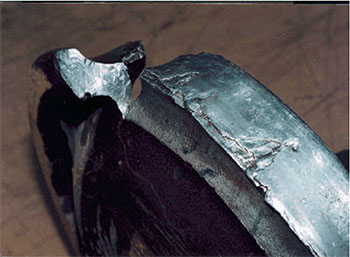 The high level of porosity observed shows that the wheel was not properly cooled, which resulted in trapped hydrogen bubbles and the creation of voids. As a result of service stresses, sub-surface cracks propagated from these voids and subsequently combined to form a larger crack below the running surface. Even though a portion of the wheel rim was not recovered, the presence of porosity and cracks and their positions indicate that the wheel failed when the sub-surface fatigue cracks intersected with the cracks caused by the shelling spots on the running surface.