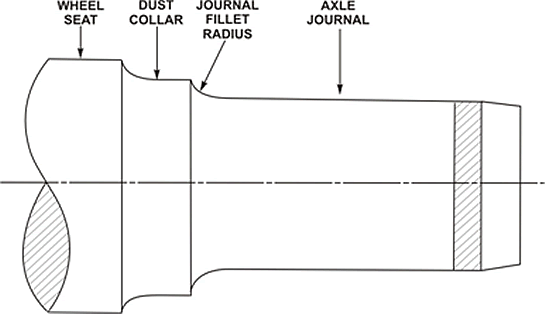 Roller bearings are press-fit onto the journals. Railway wheels are press-fit onto the wheel seats. The journal and wheel seat have different cross-sectional diameters. There are two consecutive radii which transition from the larger diameter wheel seat to the smaller journal. The dust collar extends from the wheel seat to the top of the journal fillet radius; in turn, the journal fillet radius extends from the bottom of the dust collar to the journal surface. Both are supposed to be smooth contoured transitions (see Figure 2).