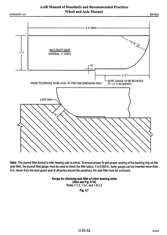 Rule 1.1.2 indicates that second-hand (reconditioned) axles must conform to G-II Manual dimensions and specifications, including those shown in Figure 4.7 of the manual. This figure details the journal fillet gauge that must be used for qualifying the journal fillet radius profiles of reconditioned axles. It also contains a note stating that "the journal fillet area of a roller bearing axle is critical. To ensure proper fit and proper seating of the roller bearing backing ring on the axle fillet, the journal fillet gauge must be used to check the fillet radius." The journal fillet gauge contains a 1/16 inch-deep by 2½ inch-long recess along its base that extends from near the bottom of the journal fillet radius profile, along the journal surface (see Figure 3).