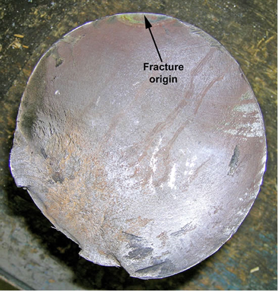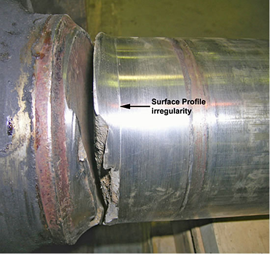 - The profile irregularity exhibited a slightly angular transition between the journal fillet radius and the journal surface. The root of the angle coincided with the root of the journal fillet radius. The fracture origin corresponded to the root angle of the profile irregularity.