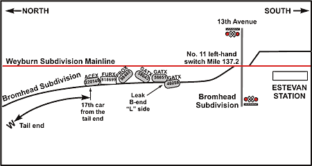 The train stopped in Estevan, with the rear of the train just past the No. 11 left-hand mainline switch at Mile 137.2. That switch leads onto the Bromhead Subdivision. While the crew was reversing the train westward onto the Bromhead Subdivision, there was a train-initiated emergency brake application. After conducting the necessary emergency procedures, the crew determined that six cars (the 17th to the 22nd cars from the tail end) had derailed at Mile 0.01 of the Bromhead Subdivision. The crew disconnected the head end of the train and pulled clear of the derailment area.