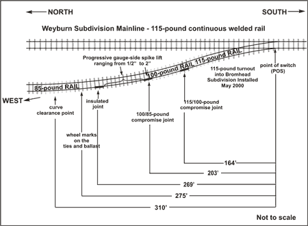 On 16 August 2004, all 85-pound rail was replaced beyond the clearance point of the Bromhead turnout curve with 100-pound rail sections, set on double-shouldered tie plates secured with three spikes per plate.