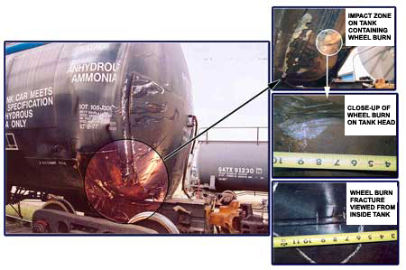 - The B-end of the tank car sustained a small through fracture as a result of an impact with the flange of a wheel during the derailment. No pre-existing primary or secondary fractures were observed.