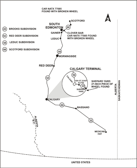 Car NATX 77085, a loaded tank car containing fuel oil (UN 1993), originated in Latta, Indiana, United States, on 02 February 2005, and then was transported via train CP 248 to Bensenville, Illinois, United States, on February 3. The car departed Bensenville on train CP 297-05, entered Canada at North Portal, Saskatchewan, and proceeded westward through Medicine Hat, Alberta. On 09 February 2005, the car went through Shepard Yard, Alberta, and was set off train CP 297-05 at Alyth Yard in Calgary, Alberta. The car departed Alyth Yard on February 10 on train CP 456-09, went through Red Deer, Alberta, and was set off at Morningside, Alberta. The car was subsequently lifted by train CP 261-13 at Morningside and transported to Clover Bar. On February 15, the broken wheel (position R3) on car NATX 77085 was discovered in Clover Bar (see Figure 1).