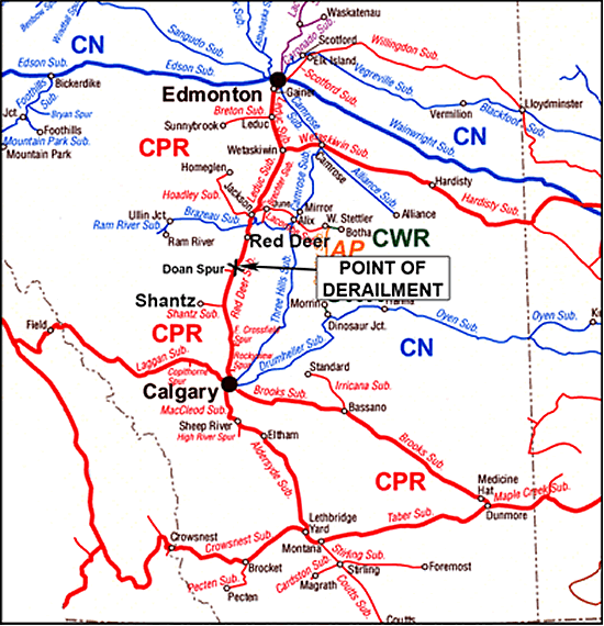 The Red Deer Subdivision is a single main track that extends from Mile 0.0 in Calgary to Mile 95.6 in Red Deer. Train movements are governed by the Occupancy Control System (OCS) of the Canadian Rail Operating Rules (CROR) and supervised by an RTC located in Calgary. Authorized track speed for freight trains was 45 mph however, at the time of the derailment, the following temporary slow orders were in effect (see Figure 2):