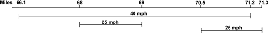 - 40 mph between Mile 66.1 and Mile 71.2 - due to excessive cross-level variation