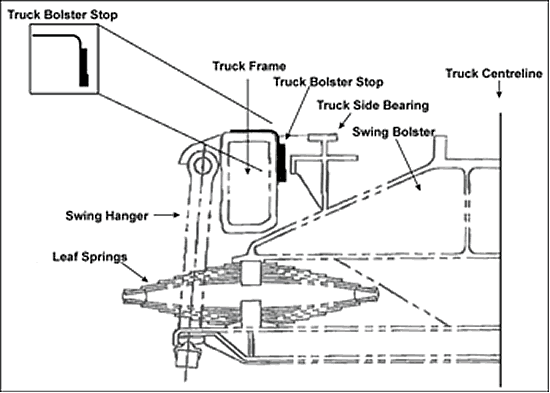 GM's GP 9 locomotives have swing hanger design trucks. The truck bolster swings laterally, minimizing impacts between the bolster and the car body so that lower lateral forces are transmitted to the track structure. At the bottom of the bolster bowl, liners assist truck bolster and car body movement by maintaining side bearing clearance. Inadequate truck bolster bowl lubrication can wear the liners to create zero side bearing clearance, which adversely affects truck swivel and can contribute to increased lateral forces being placed on the rail at the wheel-rail interface.
