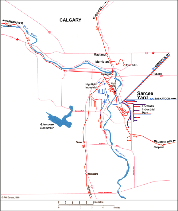 The CN Sarcee Yard is in an industrial area of southeast Calgary (see Figure 1). Orientated in an east-west direction, it is bordered by Barlow Trail to the west and 52nd Street SE to the east. Both are busy roads with a majority of traffic being tractor-trailers (see Figure 2). To the north, 50th Avenue SE runs parallel to the yard. Yard assignments serve the industrial areas around the yard and throughout Calgary. Sarcee Yard serves traffic between Calgary and Edmonton, Alberta, and Calgary and Saskatoon, Saskatchewan. Traffic between Canadian Pacific Railway (CPR) and CN is interchanged at the CPR Alyth Yard. There are commercial and industrial properties adjacent to the yard with residential property to the north.