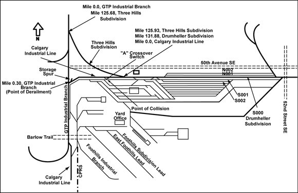 On 13 July 2005 at 1045 mountain daylight time,Footnote 1 Canadian National (CN) freight train A443-51-06 (train 443) was making a reverse switching movement with 2 locomotives pushing 141 cars eastward in CN's Calgary Sarcee Yard. While pushing at about 5 mph, the lead wheels of the trailing truck of the 11th car (empty gondola car ICG 246601) climbed onto the guard rail and the frog of the switch at Mile 0.30 of the GTP Industrial Branch. The car's trailing truck derailed to the north side of the track at the beginning of a long right-hand curve. The train continued pushing eastward until the derailed car's wheels contacted a storage spur switch point, derailing the leading truck of the 10th car (empty centre beam flatcar TTZX 844201) on the turnout frog.