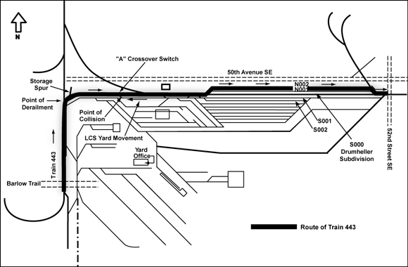 The train crew reported for duty at 0830 on 13 July 2005. The locomotive engineer was operating the two locomotives (CN 2670 and WC 6939) and the conductor was at the west N001 switch waiting to couple the eastward movement of the cars from track N001 onto the cars in track N002. The yardmaster was at the east end of track N001 waiting to line the N001 switch for the eastward movement onto the Drumheller Subdivision and over the 52nd Street SE crossing.