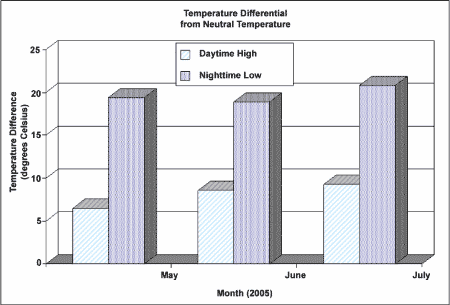Plotted below in Figure 1 is the temperature differential for the rail at this location since the May 2005 test. The daytime differential averaged 6 to 9 degrees and 19 to 21 degrees at night. At the time of the derailment, the differential temperature was 21 degrees.