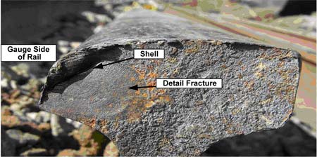 - Rail fragmentation was due to the formation of transverse defects along the full length of the 40-foot maintenance rail. These had initiated in regions of shelling,Footnote 13 itself the result of high traffic density and loading.