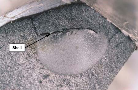 Shells are difficult if not impossible to find by conventional ultrasonic detection. Their presence can be detected visually as dark spots irregularly spaced on the gauge side of the running surface, or if the cracks branch and grow to the surface, crescent-shaped pieces may break away right at the gauge corner of the rail. The Hayange rail displayed none of these features.