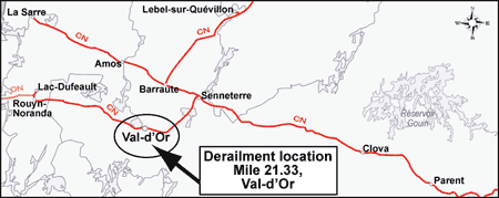 On 31 July 2005, at approximately 1316 eastern daylight time, Canadian National freight train L577-21-31, travelling westward at 31 mph, derailed nine cars at Mile 21.33 on the main track of Canadian National's Val-d'Or Subdivision. Seven of the derailed cars were bulkhead flat cars loaded with logs, and two were gondola cars loaded with copper concentrate. There were no injuries and there was no release of copper concentrate.