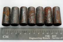 Visual examination of the bearing components of the R-2 wheel on car JRDX 490038 revealed deformation and discolouration consistent with severe overheating and bearing seizure identified in other roller bearing failures and axle burn-offs. Just before the derailment, the roller bearing overheated and seized. The axle then extruded, resulting in a reduction in cross-sectional thickness. After sufficient thinning, the overheated axle could no longer support the weight of the car, leading to a complete axle fracture.
