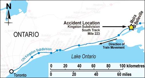 At approximately 0200 eastern standard timeFootnote 1 on 11 November 2006, two Total Track Railway Construction and Maintenance Services Inc. (Total Track) employees were operating a Nordco Model A spike pullerFootnote 2 in the vicinity of Mile 223.0, just west of Belleville, near Moira, Ontario (see Figure 1). They were part of a tie gangFootnote 3 under contract to Canadian National (CN) Railway and were replacing ties on the south main track of CN's Kingston subdivision. The temperature was about 4°C and the wind was from the north at 13 km/hFootnote 4