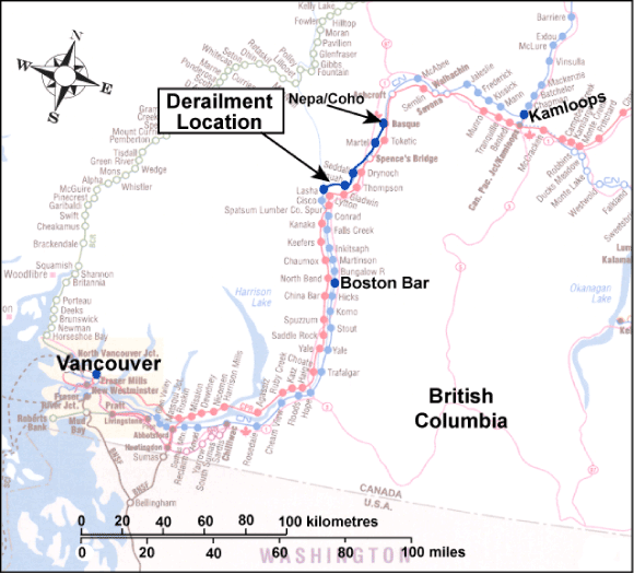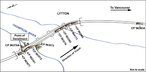 At approximately 2207 Pacific daylight time on 31 July 2006, Canadian Pacific Railway freight train 803-111, proceeding westward from Kamloops to Vancouver, British Columbia, derailed 20 loaded coal cars while travelling across the bridge over the Thompson River at Mile 97.4 of Canadian National's Ashcroft Subdivision near Lytton, British Columbia. The derailment resulted in extensive damage to the track and bridge. Twelve cars fell off the bridge, spilling approximately 1400 tons of coal into the river. There were no injuries and there was minimal environmental damage.