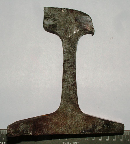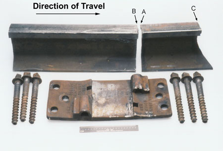 Both pieces of the high rail, the tie plate, six lag screws, and the supporting tie were sent to the TSB Engineering Laboratory for further examination.