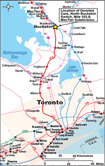 On 31 January 2006, at approximately 0750 eastern standard time, southward Canadian Pacific Railway freight train 230-30 derailed one car at Mile 114.65 of the MacTier Subdivision. The train continued at 45 mph to Mile 103.48 near Buckskin, Ontario, where it experienced an undesired emergency train brake application and 11 additional cars derailed. Approximately 400 feet of track, including the Buckskin Siding north turnout and signal structures, were destroyed and the preceding 11 miles of track was heavily damaged. There were no dangerous goods involved and no injuries.