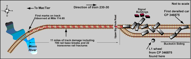 In the immediate derailment area, approximately 400 feet of track, including the Buckskin Siding north turnout and signal structures, was destroyed and a signal building was damaged. At the north end of the derailment site, heavy gauge side damage to rails, anchors, tie plates, and crossties was observed. From this location, track damage consistent with wheel impacts extended northward on the main line for approximately 11 miles to a series of short trestle bridges that traverse the Moon River. The first marks observed were at Mile 114.65, on the base of the east (high) rail of a three-degree, right-hand curve (in the direction of travel). Within the 11 miles of damaged track, approximately 700 rail base breaks and 22 transverse rail fractures were observed. Eight miles of continuous welded rail (CWR) had to be replaced (see Figure 2).