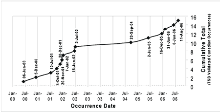 From 2000 to date, CN has documented a total of 15 main-track derailments in Canada caused by loose wheels (see Figure 3). A detailed listing of these derailments is presented in Appendix A. In addition, it has documented at least two other loose wheel derailments that occurred outside Canada. CN has reported an additional 48 wheel sets with loose wheels detected by subsequent inspection (see Appendix B). In each of these cases, the wheels were mounted by the CN Transcona wheel shop between April 1998 and February 2001 and became loose.