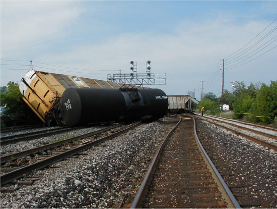 At approximately 1348, at Mile 6.0 of the CN Oakville Subdivision, near Mimico, Ontario, the train passed over a recently installed turnout. As the train travelled over the switch at a speed of 27 mph, an in-train emergency brake application occurred. The crew detected no abnormalities as their locomotive passed over the switch. After coming to a stop and conducting the required emergency procedures, the crew inspected the train and discovered that 7 non-regulated cars had derailed (72nd car to 78th car) from their 129-car train. The derailed cars were fouling all main tracks adjacent to the GO Transit passenger loading platform at Mimico Station (see Photo 1).