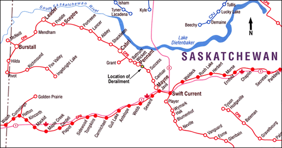 On 22 May 2006, at approximately 1224 central standard time,Footnote 1 Canadian Pacific Railway (CPR) freight train C06-22 (the train) departed Swift Current, Saskatchewan,Footnote 2 destined for the Town of Leader (see Figure 1). The train was comprised of 3 locomotives, 66 empty hopper cars, 6 loaded ballast cars and 21 residue tank cars. It weighed 3899 tons and was 5819 feet long. The three members of the train crew (a locomotive engineer, a conductor, and a trainman) were qualified for their respective positions, and met regulatory fitness and rest standards.