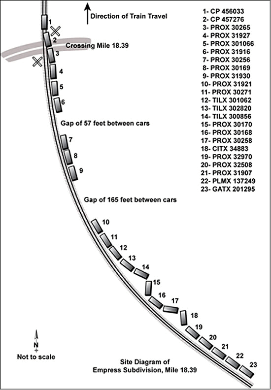 The 22 derailed cars (71st car - CP457276 to 92nd car - GATX201295) came to rest in the vicinity of Mile 18.39 (see Figure 2). The lead locomotive came to a stop at Mile 19.16.