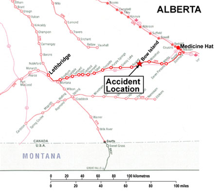 The track through the derailment area consisted of single main track in a horizontal curve, generally oriented in an east-west direction. Bow Island siding is south of the main track and extends between Mile 40.90 and Mile 42.55. It has a capacity of 7925 feet. The track gradient between the siding switches is a slight downgrade to the west.