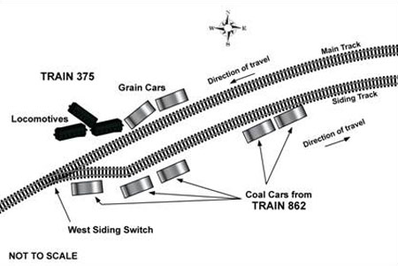 The five derailed coal cars of train 862 came to rest south of, and parallel to, the siding track east of the west siding switch; the first and fifth cars remained upright, while the other three cars rolled onto their sides and spilled their product (see Figure 2).
