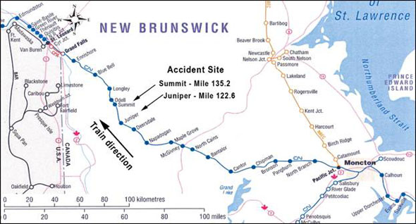 The Napadogan Subdivision is a Class 4 track according to the Transport Canada (TC) approved Railway Track Safety Rules (TSR) and consists of a single main track that extends from Pacific Junction, Mile 0.0, immediately west of Moncton, to Edmundston, Mile 219.4. Train movements are governed by the Centralized Traffic Control System in accordance with the Canadian Rail Operating Rules (CROR) and supervised by a rail traffic controller located in Montréal. In the derailment area, the maximum authorized speed for freight trains was 50 mph.