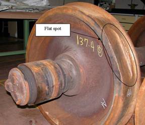 - Deposits of re-solidified wheel material were noted along the tread in line with the flat spot.