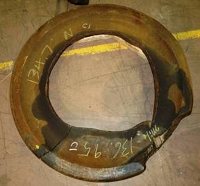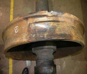 - The wheel flange had a localized area where the material was worn away as well as localized impact spots.