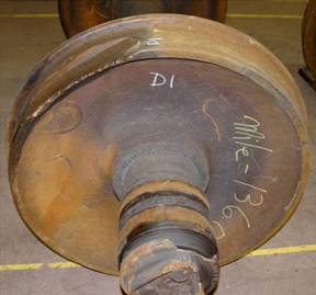 - Piece #1 was from the wheel rim and was 22 inches long and 10 inches wide. This piece had a flat spot 4.5 inches long, 3 inches wide, and 0.5 inches deep. The outer edge of the flat spot was about 1 inch from the outer edge of the wheel. Deposits of re-solidified wheel material were noted along the tread in line with the flat spot. Piece #1A was from the inner portion of the wheel and was 12 inches long and 7.5 inches wide.