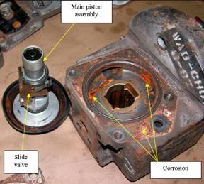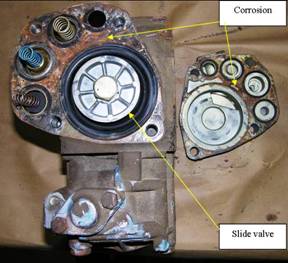The examination of the wheels, handbrake, slack adjuster, and retainer valve did not reveal any pre-existing conditions that contributed to the accident. However, the brake control valves did not pass all bench tests. Testing of the service portion could not be completed because the slide valve was stuck. Localized corrosion was noted on some of the internal components from the emergency and service brake valve assemblies (see Figure 3). It was noted that lower air pressures could make a slide valve more prone to a sticking condition. The report stated that neither the repair history nor the examination of the individual brake components (which were at least 29 years old) indicated there was a chronic brake-related problem.