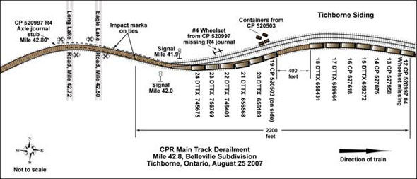 Cars 12 to 18 remained upright, coupled together, and were followed by a 400-foot gap. The 19th car, CP 520503, came to rest on its side while its containers were alongside the car in a ditch just north of the siding. The 20th to 24th cars remained upright and coupled together. Approximately 2200 feet of track, including the Tichborne west end siding turnout, and the signal mast at Mile 41.90 were damaged.