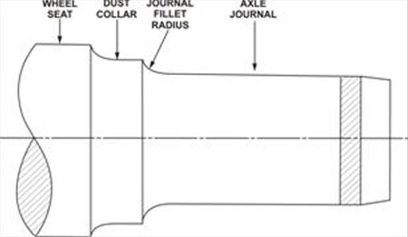 During wheelset assembly, railway wheels are press-fit onto the axle wheel seats and then roller bearings are press-fit onto the axle journals. The axle wheel seat and journal have different cross-sectional diameters connected by two consecutive radii, the dust collar and the fillet radius, that transition from the larger diameter wheel seat to the smaller journal (see Figure 3). Both the dust collar and fillet radius require smooth, contoured transitions.