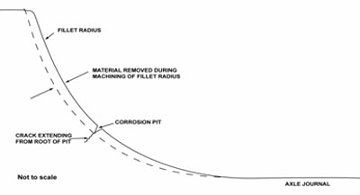 - The axle failed in fatigue which originated at corrosion pitting on the fillet radius and progressed through approximately 80 per cent of the axle's cross-section. The final failure occurred catastrophically, under normal service conditions, when the applied load exceeded the diminished strength of the journal's reduced cross-section.
