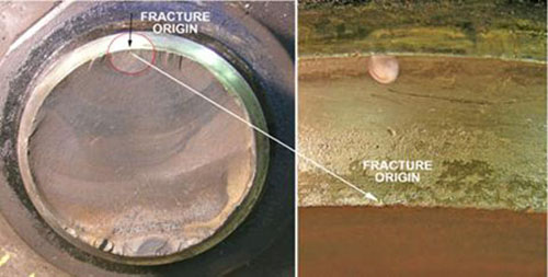 - The axle fractured in the area of the R-4 fillet radius, approximately 11 inches inboard of the end of the journal. There was no evidence of overheating. The fracture was perpendicular to the principal stresses acting on the axle. The fracture displayed primary and secondary fatigue cracks as well as a small, brittle failure zone which is normally associated with sudden or catastrophic failures. The fatigue fracture zones were characterized by beach marks which were traced back and identified an area of suspected fracture origin.
