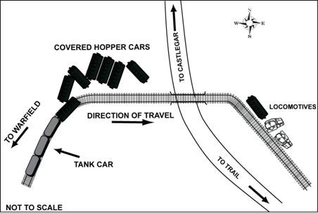 The train departing Warfield consisted of two GP 38-2 locomotives, eight loaded covered hopper cars, and three residue tank cars. It weighed approximately 1255 tonnes and was approximately 795 feet in length.