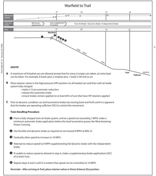 CPR Timetable 52, for the British Columbia Interior Service Area, contains specific operating instructions and train-handling procedures for trains descending Warfield Hill (see Figure 3). These procedures specify the locations and actions that must be taken on the grade and are the most restrictive on any trackage in the CPR system. Compliance using dynamic braking, supplemented by air brakes, to control train speed is intended to avoid brake shoe friction fade and to prevent uncontrolled movements.