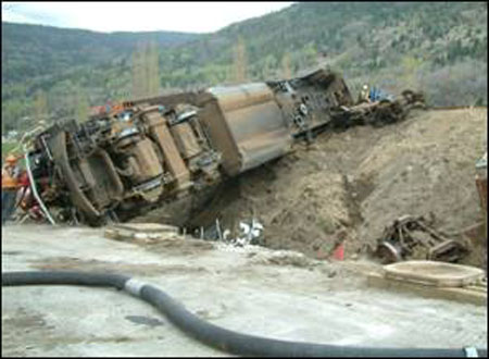 On 23 April 2007, at about 1436 Pacific daylight time, the 0700 Trail yard assignment ran uncontrolled down the 4.1 per cent grade between Warfield and Trail, British Columbia, derailing two locomotives and eight loaded covered hopper cars of granular ammonium sulphate. A foreman and a helper had detrained prior to the derailment and sustained minor injuries. The locomotive engineer remained on board and suffered fatal injuries. Approximately 20 per cent of the contents (43 836 kilograms) of the covered hopper cars and 500 gallons of diesel fuel were spilled.