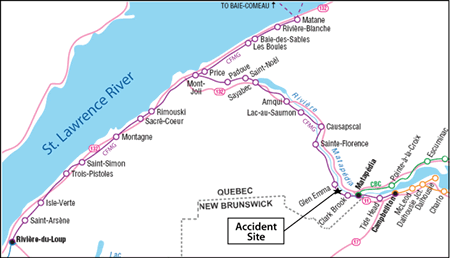 At Mile 23.32 of the Mont-Joli Subdivision (see Figure 1) on the Chemin de fer de la Matapédia et du Golfe (CFMG), when the train was travelling west at 42 mph, the locomotive engineer noticed that the train was not responding normally. He applied the service brakes gradually and stopped the train. Upon inspecting the train, the conductor found that the last five cars had derailed (12th car to 16th car). The rail traffic controller (RTC) was informed at 2215 and the passengers were transferred to the front of the train. The derailed cars were uncoupled and the train continued on its way to Montréal, Quebec.