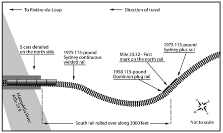 The air temperature was -3°C. The ground was covered with compacted snow and only the top of the rail was visible. The derailed cars stopped on the subgrade at the east entrance of the bridge, which is 440 feet long and spans the Matapédia River. They stayed upright and coupled to the front of the train (see Photo 1).