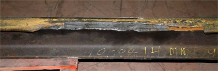 The Dominion rail showed flattening and widening of the head along most of its length. In the area that was specifically affected by the LSC, extensive progressive cracking was observed with an orientation and position in relation to the running surface that were the same as those observed for the fracture due to the VSH defect. Friction areas were also observed in the progressive crack, as well as traces of rust.