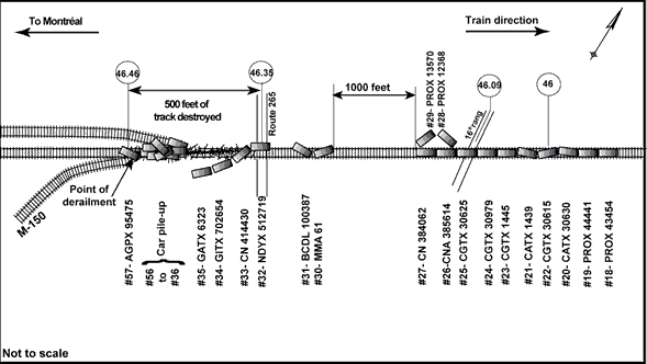 The derailment area covers a distance of approximately 2500 feet, from turnout M150 at Mile 46.46 to Mile 46.00 (see Figure 2). The section includes two public grade crossings: the Route 265 crossing at Mile 46.35 and the 16e Rang crossing at Mile 46.09. The derailed equipment consisted of seven empty tank cars, six empty box cars and twenty loaded covered hopper cars.