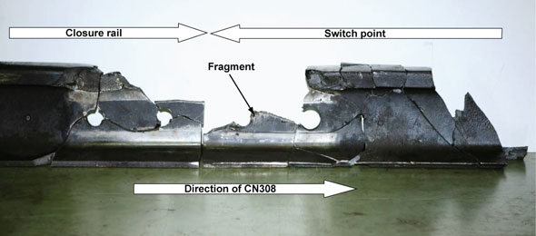- The train derailed when the switch heel block joint failed under the weight of the train.