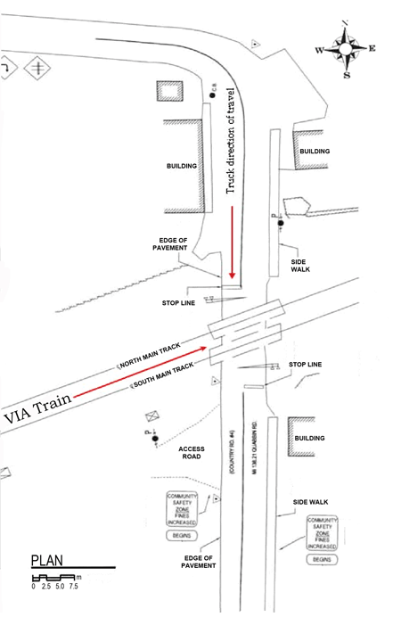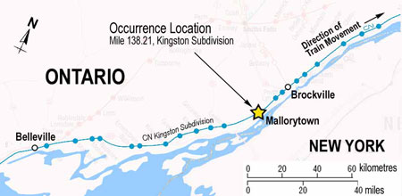 On 15 July 2008, VIA Rail Canada Inc. (VIA) train No. 60 (the train) was travelling eastward on the north main track at 83 mph. At approximately 1515,Footnote 1 approaching the whistle post, one quarter mile west of Quabbin Road, in Mallorytown, Ontario (see Figure 1), the train crew observed a tractor-trailer carrying heavy equipment stopped on the north main track. The operating locomotive engineer also observed a person standing on the track, between the stopped truck and the approaching locomotive, waving his arms. He immediately applied the brakes and sounded the locomotive horn. The person then ran to the south, away from the track.